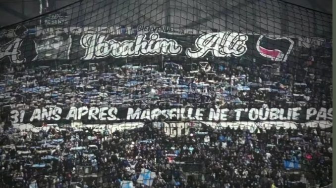 Ce dernier est un nom tristement connu dans la cité phocéenne. Ibrahim Ali est un jeune d’origine comorienne qui a été assassiné par balle par des colleurs d’affiches du Front National le 21 février 1995. Ce crime avait provoqué une certaine émotion. Dans le virage, dit virage “Depé”, le groupe Marseille Trop Puissant (MTP) lui a également rendu un hommage appuyé avec un tifo à son effigie, arborant le logo de l’antifascisme. Quelques mètres plus bas, un message: “31 ans après, Marseille ne t’oublie pas”.