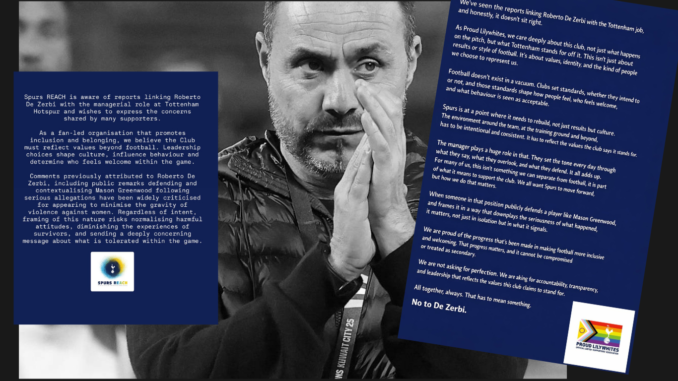 En crise de résultats en Premier League, Tottenham sonde de potentiels remplaçants au coach actuel. La rumeur la plus insistante annonce Roberto De Zerbi, ancien coach de l’Olympique de Marseille. Trois groupes de supporters – Proud Lilywhites, Women of the Lane et Spurs Reach – ont rapidement communiqué pour demander au club d’abandonner cette idée. Les raisons de cette opposition remontent à la période marseillaise de De Zerbi, marquée par le soutien public qu’il a affiché envers Mason Greenwood.