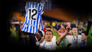 Les cris “Aitor, Aitor” ont résonné dans tout le stade. Une rivalité qui dépasse le rectangle vert. Après la victoire de la Real Sociedad, aux tirs au but, le capitaine Mikel Oyarzabal a posé un maillot bleu et blanc floqué du numéro 12 et du nom d’Aitor Zabaleta sur le trophée. S’il y a eu un douzième homme dans le stade, les supporters lui ont donné le visage d’Aitor.