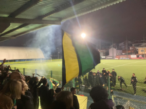 Une tribune couverte – deux blocs d’une vingtaine de mètres et quatre rangées de sièges, alternant le rouge et le bleu – nous attend. Aucun membre de sécurité évidemment. Une clôture simple torsion en pied et un terrain en synthétique. Pourquoi plus? Sont bâchés le perpétuel “Masnada” ainsi qu’un calicot “Diffidati con noi” aux couleurs jaunes et vertes. C’est une femme qui démarre au tambour, ça change et ça a le mérite d’être souligné! Le capo s’installe au pied de la première rangée, alors que de nombreuses bières canettes sont déposées à nos pieds. Deux drapeaux sont présents et flotteront constamment: un de la valeureuse Palestine, l’autre aux couleurs du club.